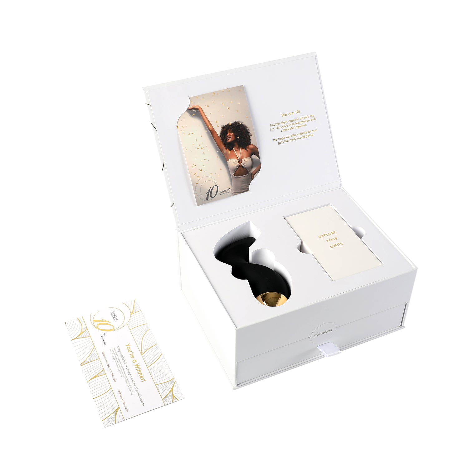Adicional, al adquirirlo tienes la posibilidad de encontrar un boleto dorado en la caja, el cual te dará el derecho de recibir 10 productos SVAKOM de tu elección.